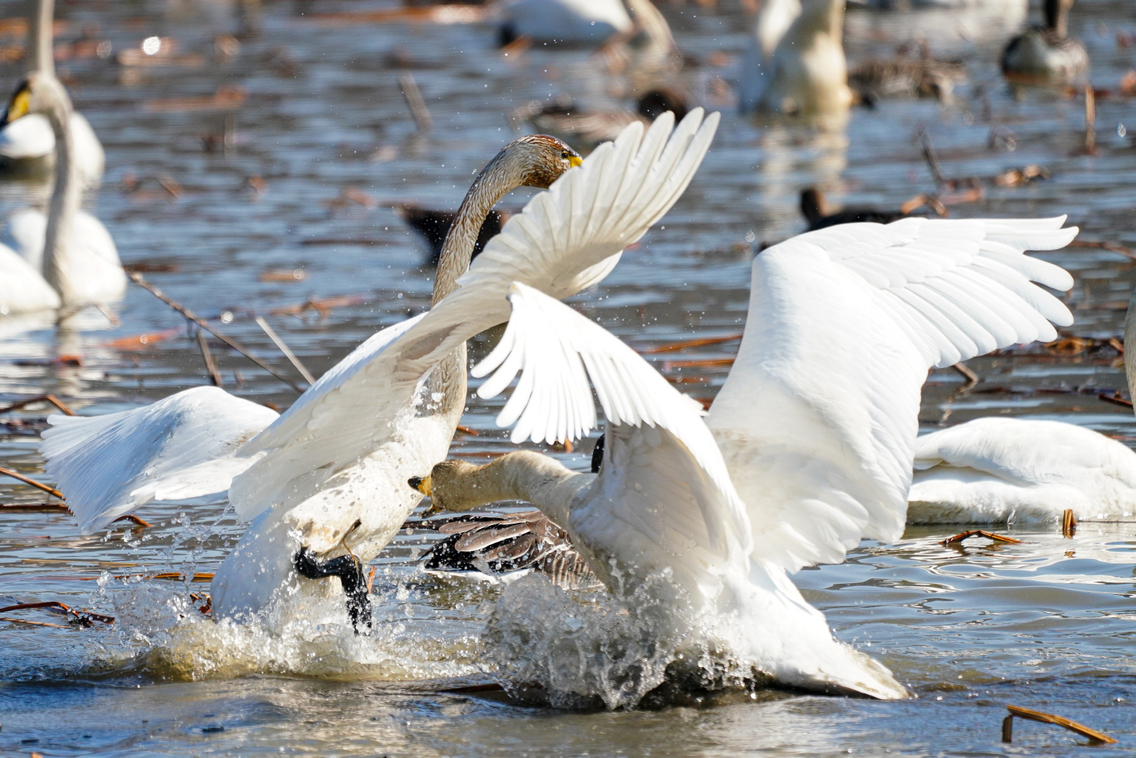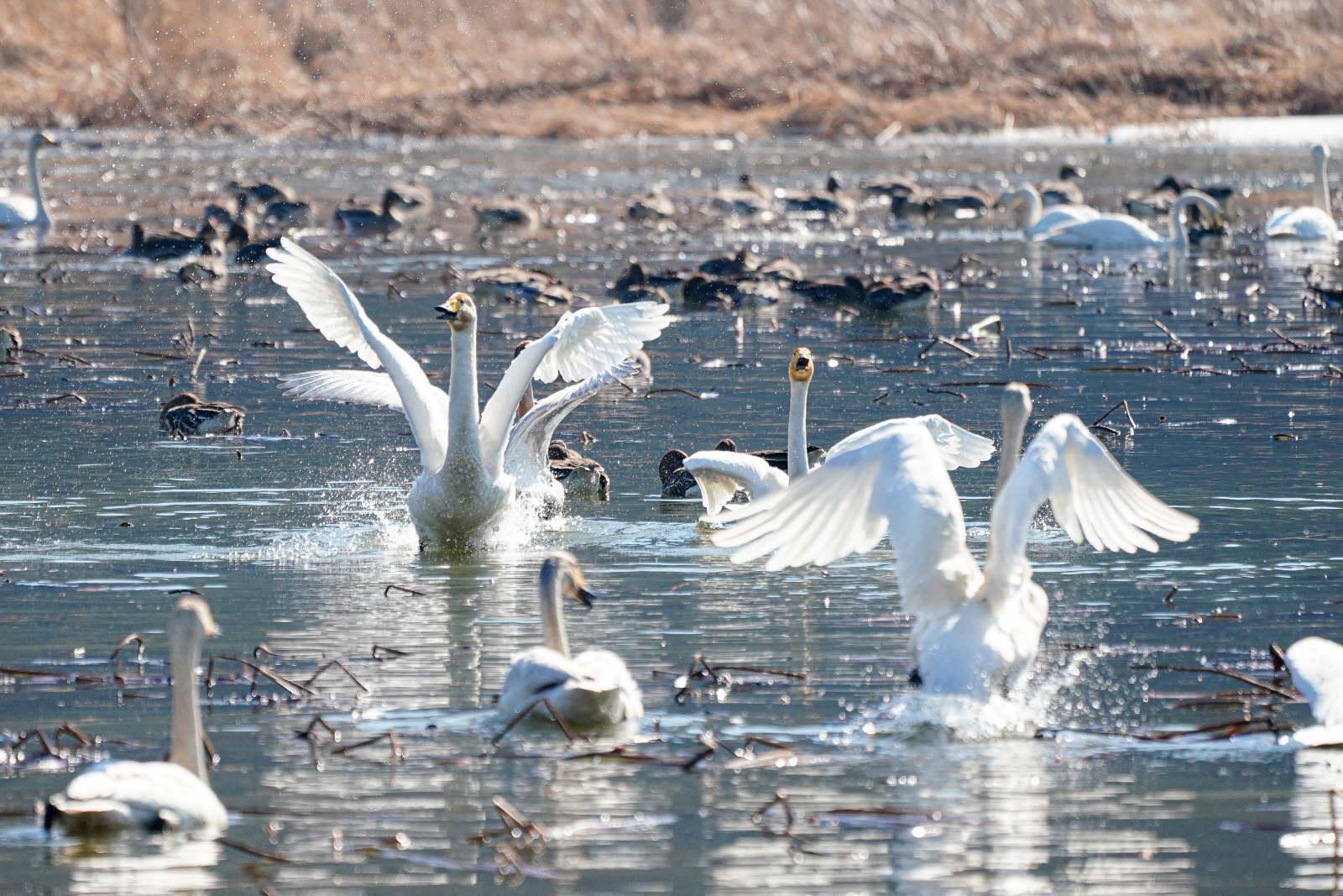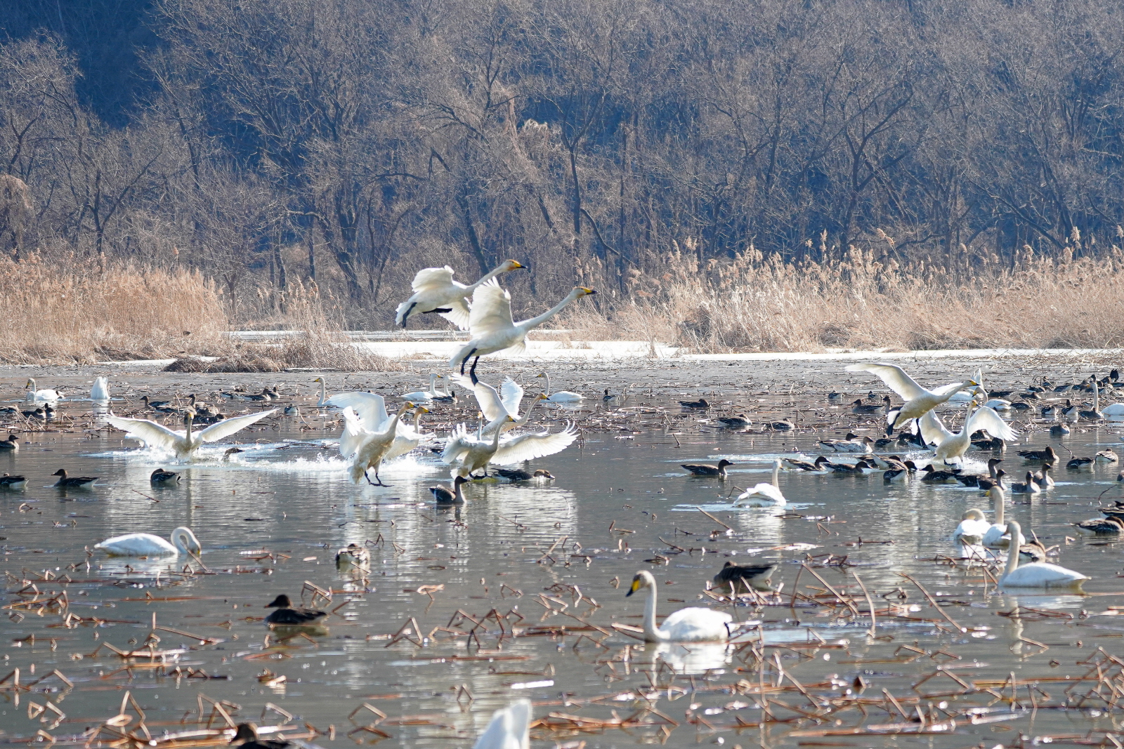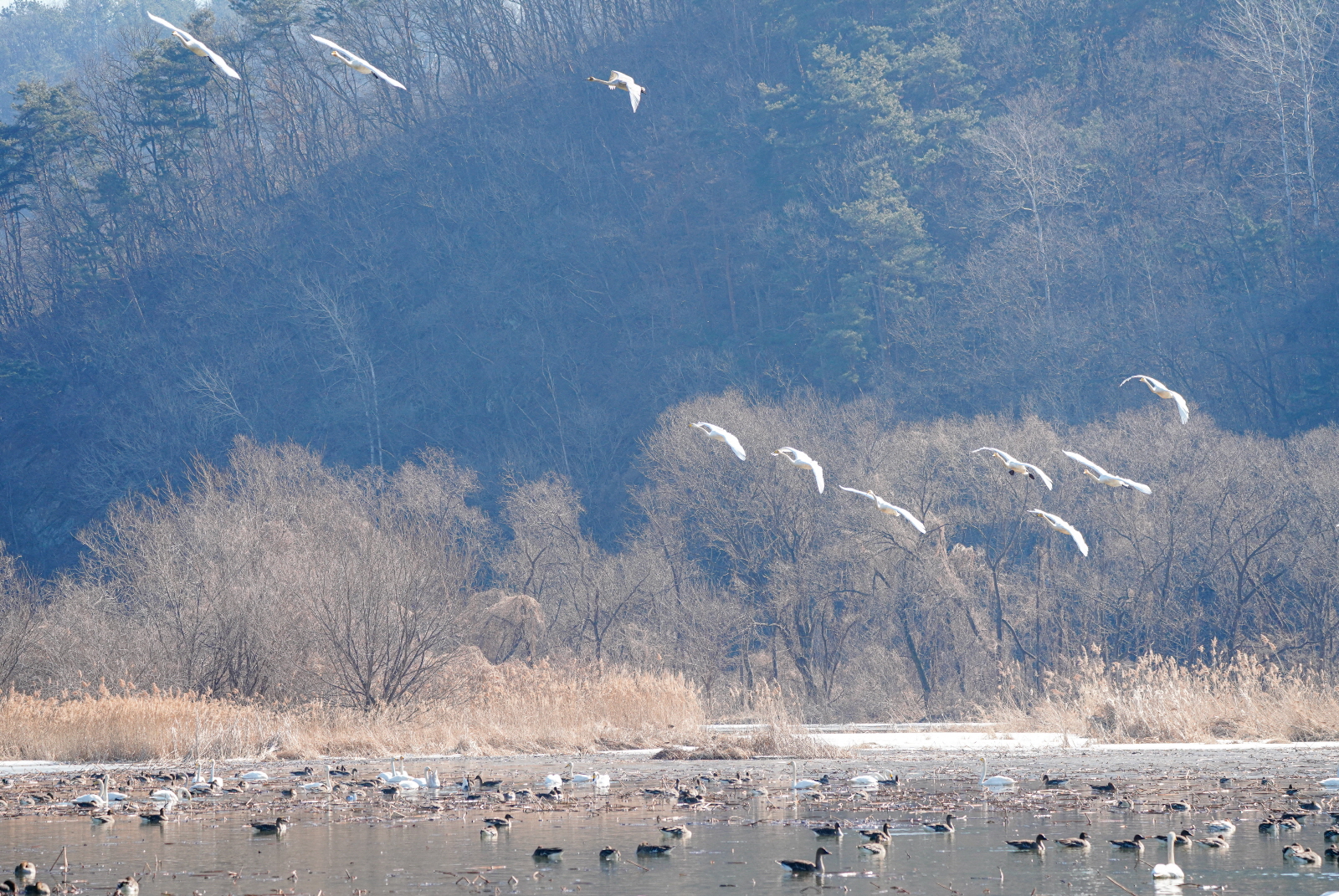 양수리는 확실히 백조가 노는 곳과 관찰위치가 가까워서 사진 촐영은 수월했다. 그런데 밀도가 높다 보니 배경이 난잡해져서 사진여백이 시원하지 못해서 애써 찍은 사진도 답답한 모습이 많이 연출되었다. 오늘은 셔터속도를 1/2000이상으로 올렸더니 촛점이 더 잘맞았다(지난 팔당에서는 1250정도). 한가지 더, 촬영드라이브는 연속촬영high로 놓았는데, 지난번은 연속 AF촛점, 이번에는 단일촬영AF촛점에 놓으니 촛점이 오히려 잘맞았다. 오늘은 온도가 올라가서 그런지 백조들 활동이 확실히 활발해지니 사진에 담을것은 많았다