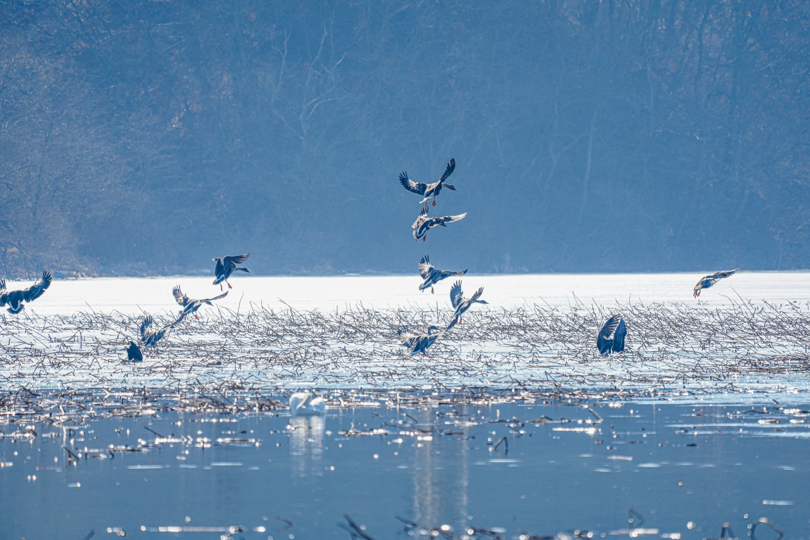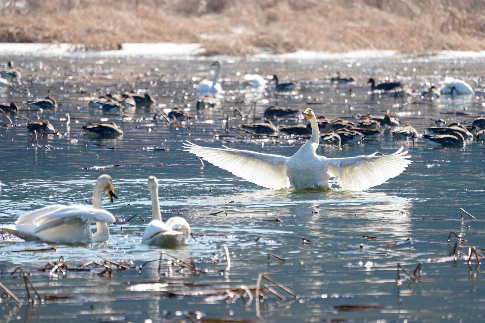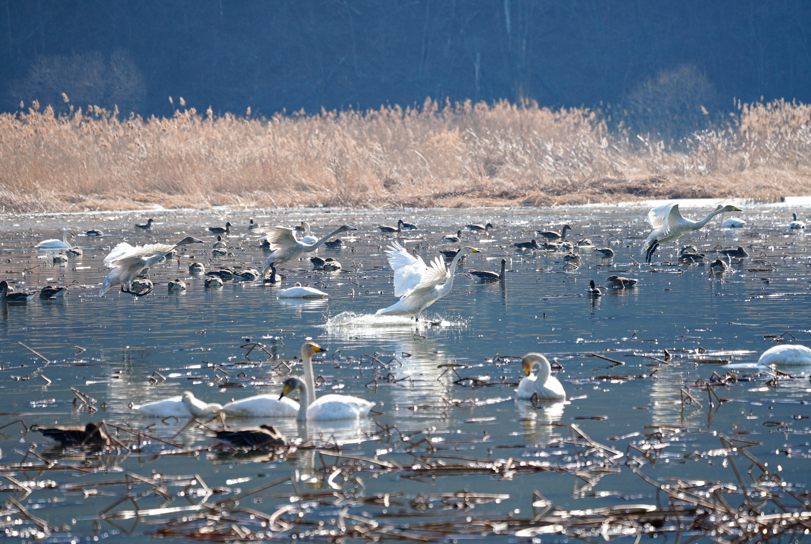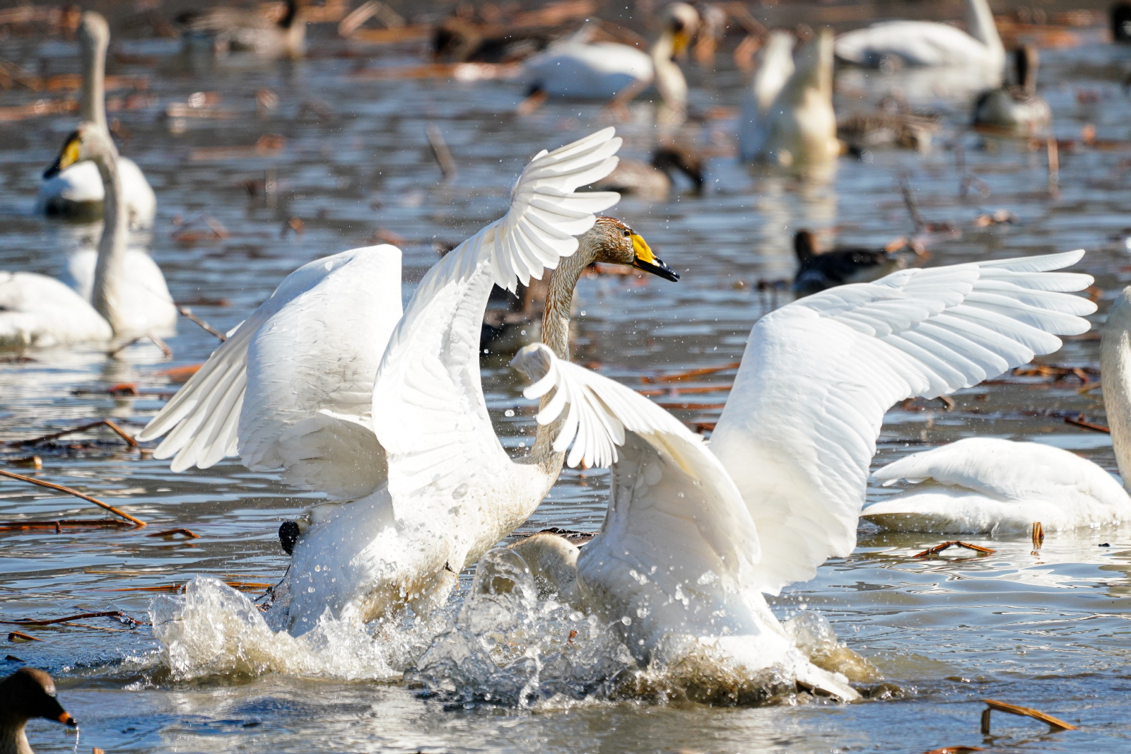 양수리는 확실히 백조가 노는 곳과 관찰위치가 가까워서 사진 촐영은 수월했다. 그런데 밀도가 높다 보니 배경이 난잡해져서 사진여백이 시원하지 못해서 애써 찍은 사진도 답답한 모습이 많이 연출되었다. 오늘은 셔터속도를 1/2000이상으로 올렸더니 촛점이 더 잘맞았다(지난 팔당에서는 1250정도). 한가지 더, 촬영드라이브는 연속촬영high로 놓았는데, 지난번은 연속 AF촛점, 이번에는 단일촬영AF촛점에 놓으니 촛점이 오히려 잘맞았다. 오늘은 온도가 올라가서 그런지 백조들 활동이 확실히 활발해지니 사진에 담을것은 많았다