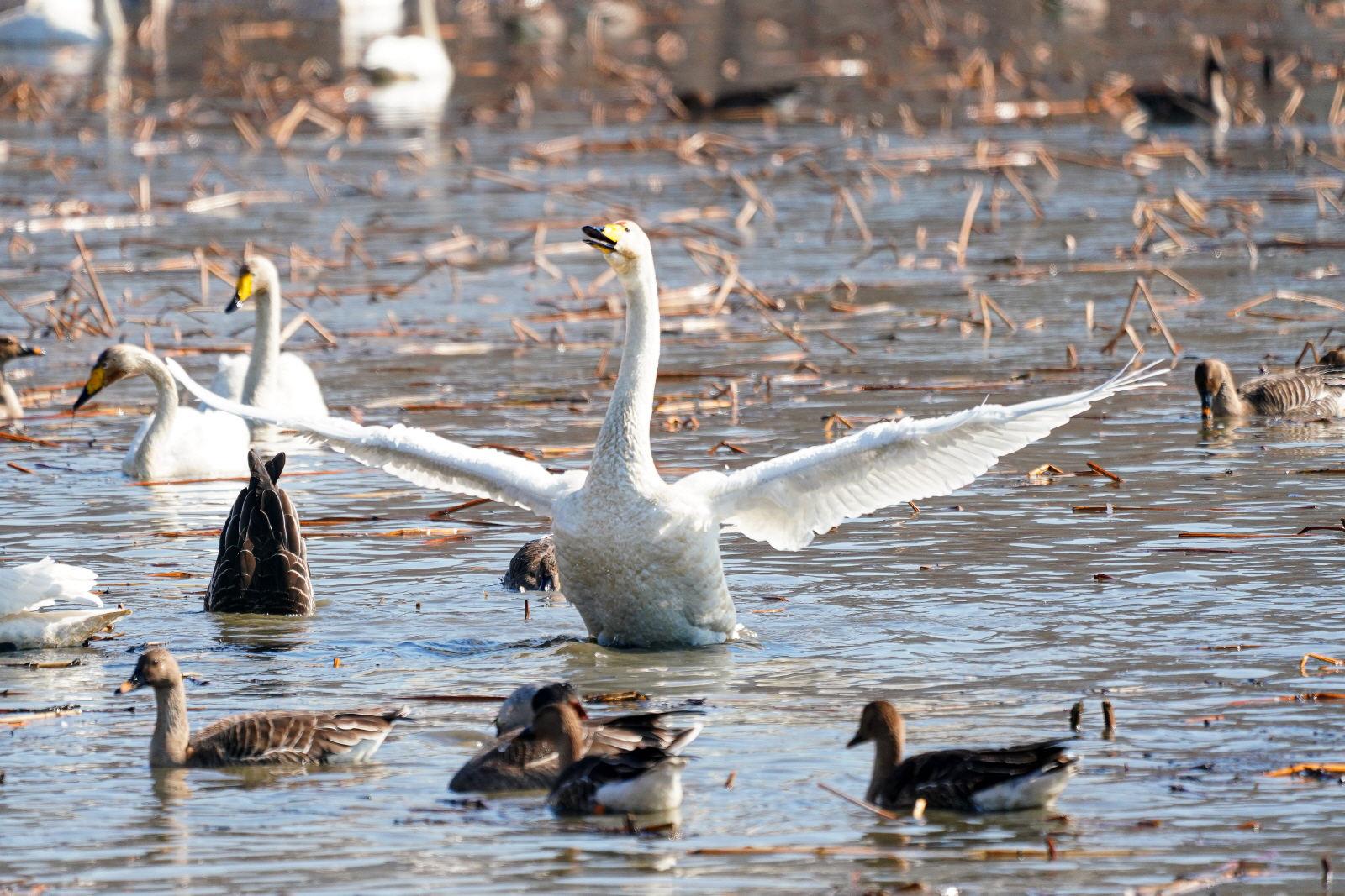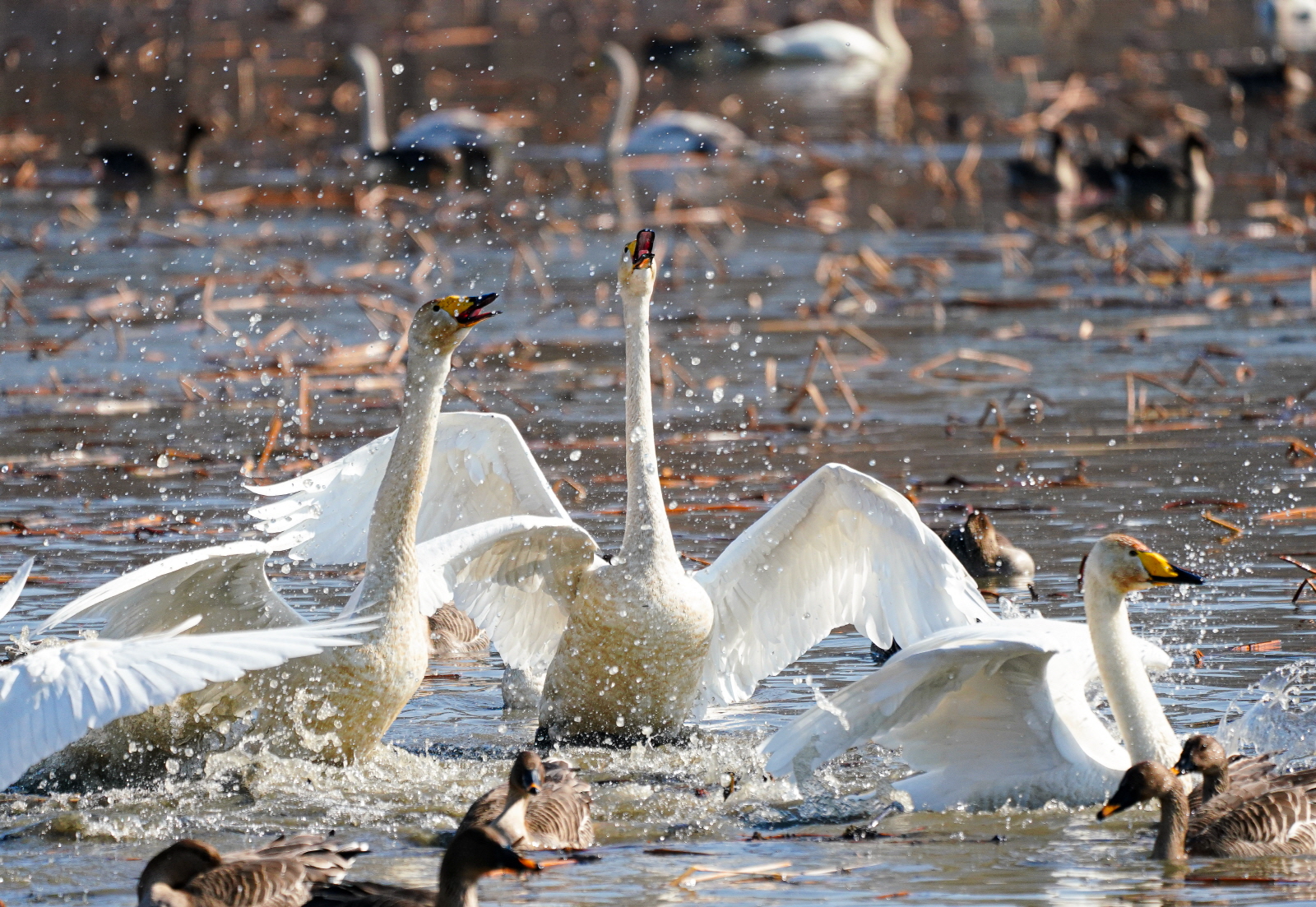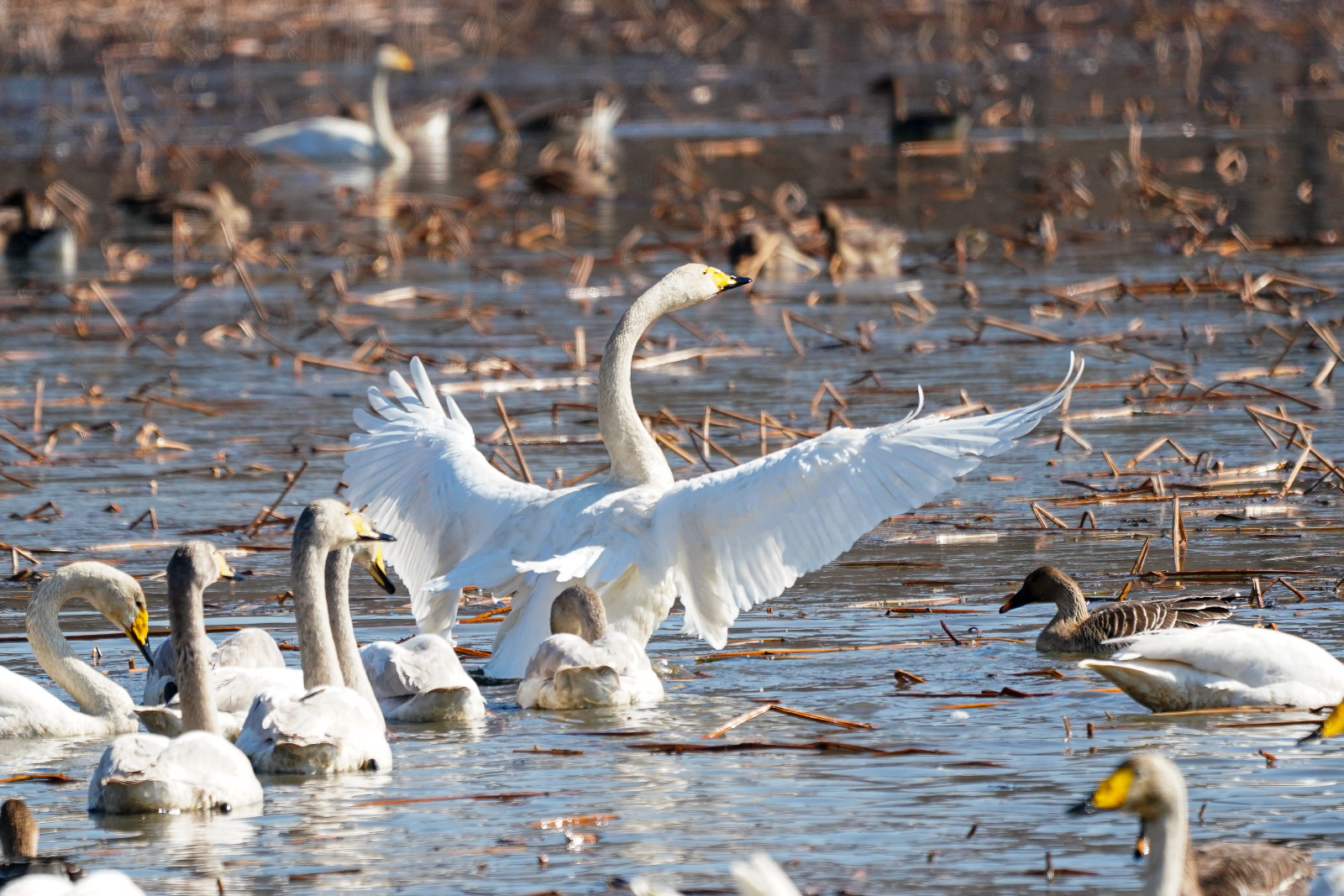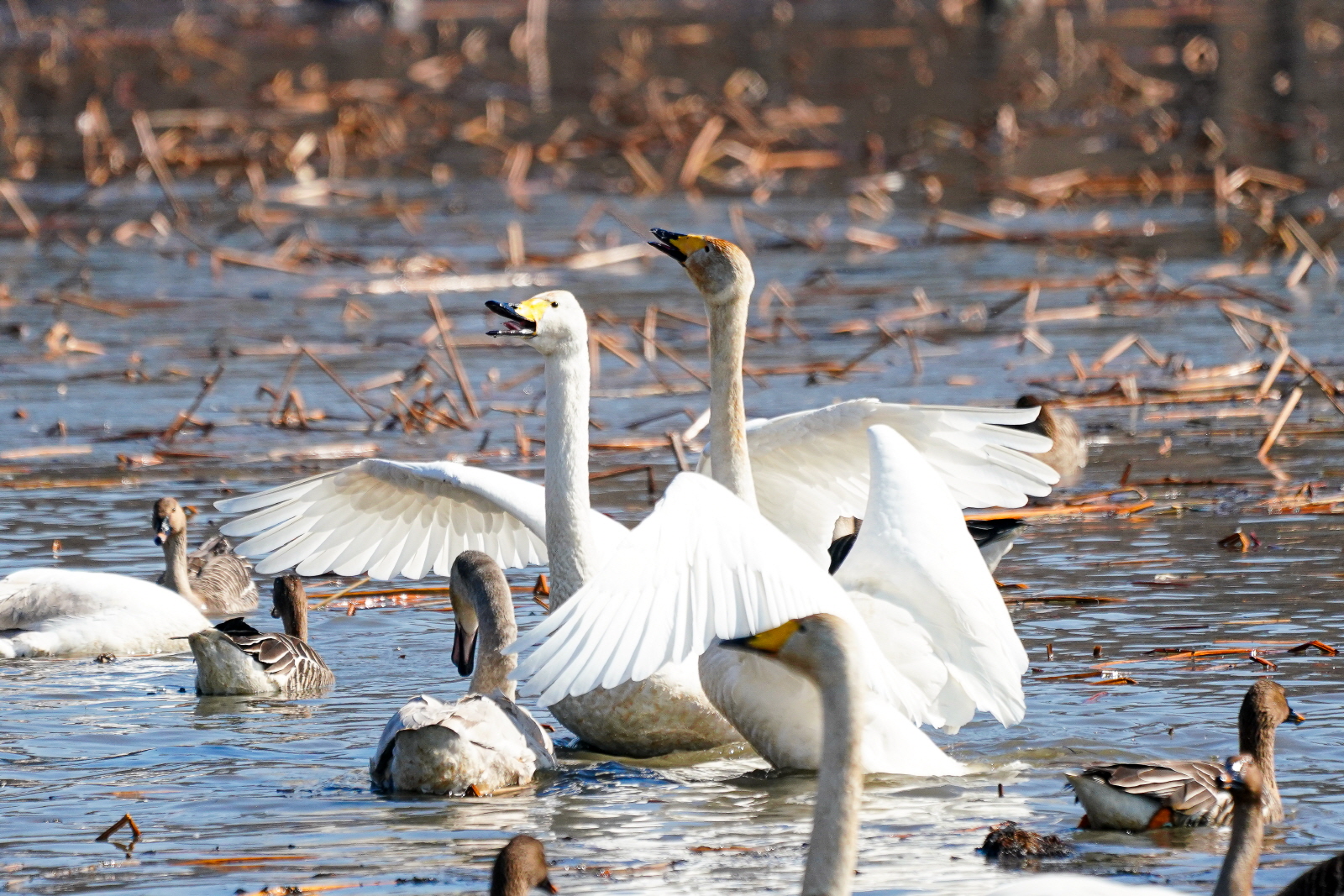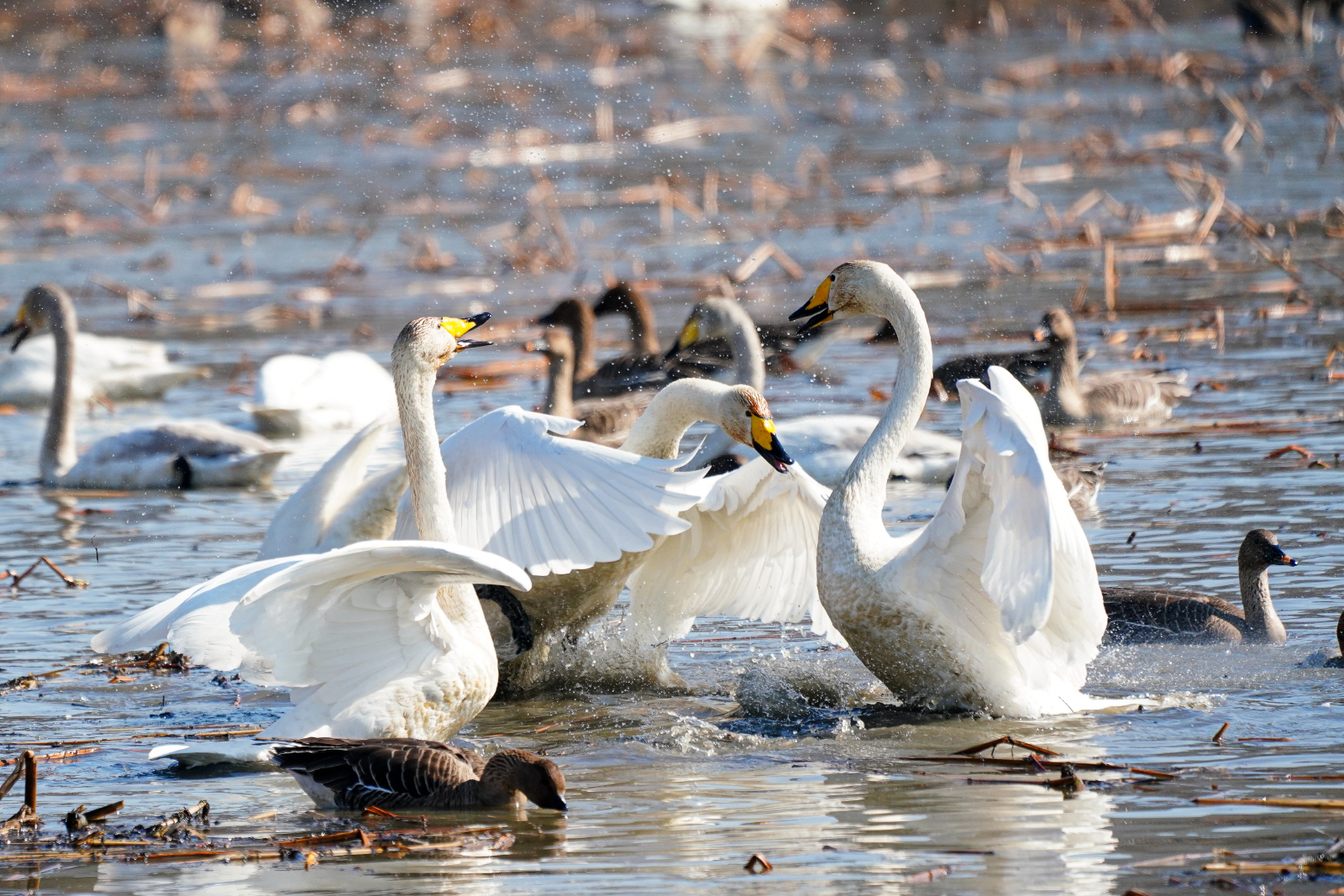 양수리는 확실히 백조가 노는 곳과 관찰위치가 가까워서 사진 촐영은 수월했다. 그런데 밀도가 높다 보니 배경이 난잡해져서 사진여백이 시원하지 못해서 애써 찍은 사진도 답답한 모습이 많이 연출되었다. 오늘은 셔터속도를 1/2000이상으로 올렸더니 촛점이 더 잘맞았다(지난 팔당에서는 1250정도). 한가지 더, 촬영드라이브는 연속촬영high로 놓았는데, 지난번은 연속 AF촛점, 이번에는 단일촬영AF촛점에 놓으니 촛점이 오히려 잘맞았다. 오늘은 온도가 올라가서 그런지 백조들 활동이 확실히 활발해지니 사진에 담을것은 많았다