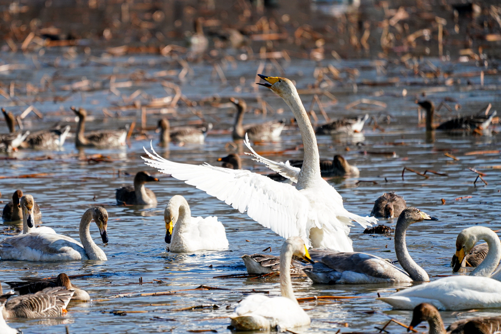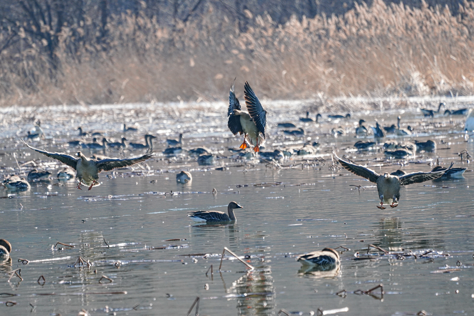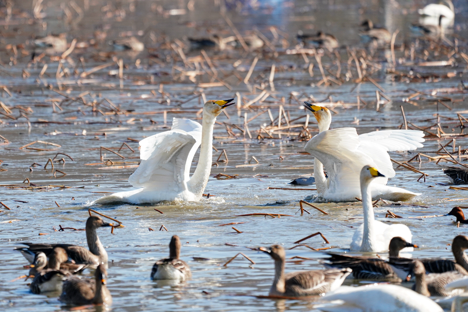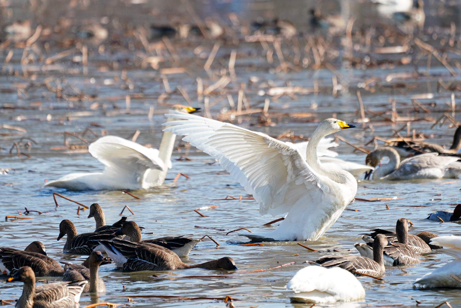양수리는 확실히 백조가 노는 곳과 관찰위치가 가까워서 사진 촐영은 수월했다. 그런데 밀도가 높다 보니 배경이 난잡해져서 사진여백이 시원하지 못해서 애써 찍은 사진도 답답한 모습이 많이 연출되었다. 오늘은 셔터속도를 1/2000이상으로 올렸더니 촛점이 더 잘맞았다(지난 팔당에서는 1250정도). 한가지 더, 촬영드라이브는 연속촬영high로 놓았는데, 지난번은 연속 AF촛점, 이번에는 단일촬영AF촛점에 놓으니 촛점이 오히려 잘맞았다. 오늘은 온도가 올라가서 그런지 백조들 활동이 확실히 활발해지니 사진에 담을것은 많았다